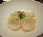 JH:この料理に関してはコメントが難しい。大根の苦味とホタテの甘味とホタテと大根の煮汁で作ったジュがあって、そこにこの2本目の場合は酸が、1本目の場合はオイリーさが合わさって、じゃあ何が生まれるかというと、そこが難しい。何も生まれないのかも知れない(笑)。もちろん邪魔もしていないのですけど、別個の何かが生まれるかというと難しい。ワインと料理を合わせるのって、やっぱり難しいですよ。