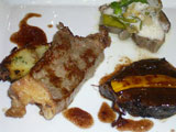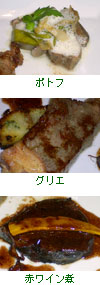 牛肉は若い雌牛のもの。さすがに柔らかく繊細である。食べる順番はポトフ、グリエ、煮込みの順番で3人が一致した。まず腿肉のポトフは肉も柔らかく、風味が良く出ており、上品で繊細な仕上がり。煮汁に牛乳と生クリームを少し加え、泡立てている。グリエはしっかりした味で、中はちょうどいい状態で火が通っており、3品の中では牛肉本来の味が一番出ている。かた肉はこってりした赤ワインソースが絡まるようにかかっており、いわゆるブフ・ブルギニョン(牛肉の煮込み、ブルゴーニュ風)を照り焼きにしたよう。
