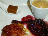 今回のエルミタージュ ヴァン・ド・パイユの生産者はカーヴ・ド・タン・レルミタージュで、1996年ものである。デザートは、この店のスぺシャリテのパン・ペルデュ(いわゆるフレンチトーストで、この店では通常は前日に残った硬くなったバゲットパンをそれほど長く牛乳に漬け込まず、からっとした感じで仕上げているが、今回はかなりしっかり汁に漬け、表面をしっかりキャラメル化していた)とキャラメル・サレ(塩バターのキャラメル)、キャラメルのアイスクリームに、フランボワーズ、カシス、サクランボなどの赤いフルーツを甘く煮詰めたものが添えてある。