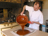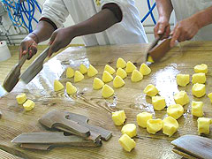 無塩バターが基本と言われるお菓子作りにも、ものによっては、きめ細かい塩分をじっくりとなじませた有塩バターのほうが、風味も使い勝手もよい、と私に教えてくれたのはカンカルにある「グラン・ド・ヴァニーユGrain de Vanille」のシェフ、ヤニック・ゴティエ氏です。ここは2006年ミシュラン3つ星に輝いた「メゾン・ド・ブリクールMaison de Bricour」のオーナーシェフ、オリビエ・ロランジェ氏と共同経営するパティスリー&サロン・ド・テです。素材の質にこだわり、伝統的製法を重んじる両氏が推薦するのがこのバターです。実は私はこのお店で研修をし、このボルディエバターに出会いました。有塩バターがたっぷりと入ったブルターニュの地方菓子、ガレットやポメをはじめとする素朴な焼き菓子を最高級の素材でレベルアップして作っています。このお店のスペシャリテ、キャラメル・ブール・サレCaramel beurre saleやガレット・カンカレーズGalette Cancalaise作りには、その風味の決め手となるボルディエ氏のバターなしでは考えられないとゴティエ氏はいいます。他にもブリオッシュのような発酵生地を作る場合、塩の接触が間接的な有塩バターは、イースト菌の活動を妨げないそうです。