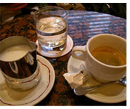 店の名前も由緒を感じさせます。ネゴスィアンは、フランス語で卸商人の意味ですが、この店で商いの交渉をおこなったことに由来しているとか。「いろいろなネゴスィアン達がカフェを片手に交渉を繰りひろげたのだろうな」と、当時に思いをはせつつ、早速カフェ・クレムを注文。ここのカフェ・クレムは、カフェとミルクが別にサービスされ、自分の好みで濃さを調節できるとても嬉しいスタイル。
