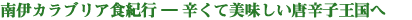 イタリア北部に住んでいた頃のこと。アクセントにペペロンチーノPeperoncino(唐辛子)を少々入れたパスタを作って知人に出したら、知人は「エ・トロッポ・ピッカンテÈ troppo piccante (辛すぎる)! カラブレーゼCalabreseにしか食べられないよ」と冗談半分に、食べるのをためらう。カラブレーゼとは、南部カラブリアCalabria州の人のこと。この地域の人は「大の唐辛子好き」とイタリア全土で知られており、唐辛子を効かせたサラミや料理などには大抵“カラブリア風”の名前が付いていた。ときに「カラブレーゼ=度外れた辛い物好き=ついていけない」という他地域のイタリア人の微妙な感情も感じる事があった。「ちょっぴり辛いからこそ美味しい」と思って作ったパスタをけなされて悔しかった事が直接の動機、と言うわけではないけれど、巷に聞く「辛いもの好き王国」のようなカラブリアへの親しみは日々強くなっていった。いつかかの地へ行って“辛いけど美味しい”体験を、地元の人と共有してみたいと思いながら月日が過ぎた。
