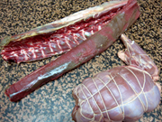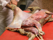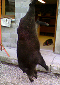 3か月まではアン・リヴレen livréeと呼ばれ、狩りが禁止されている。6か月まではマルカッサンmarcassin、6か月から1歳まではベット・ルッスbête rousse、1歳からはベット・ド・コンパニbête de compagnie、2歳になるとラゴragot、3歳ティエー=ザンtier-ans、4歳カルトゥニエquartenier、と年齢によって呼び方が変わる。体長は90〜180cm、体高55〜110cm、体重50〜150kg。雌は80〜90kg。平均寿命は15歳だが30歳まで生きられると言われている。毛が黒く、すばっしこいので、仕留めるにはテクニックが要求される。性別の判断が難しく、仕留めた後、生殖器で判断することが多い。肉食。 |