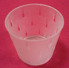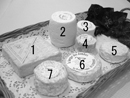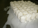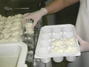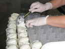 ・ 専用のチーズ型に山盛りに凝乳を入れる。1回で60個の型に入れていく。