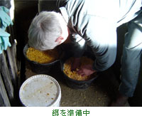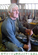 こういった厳しいガヴァージュ期間は鵞鳥もデリケートになっているため、作業はメイナールさんと奥さん以外は絶対にしないそうである。さて、主人のメイナールさんは薄緑の作業服を着て小屋に入り、ガヴァージュの準備をする。服装は鵞鳥達を驚かせないため、いつも決まった格好をする。メイナールさんは鵞鳥の身体をしっかりと押さえ、喉の中へじょうごのようなガヴァージュ専用機械を入れ、手早く餌のとうもろこしを流し込んでいく。