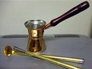 ギリシャコーヒー「エリニコ」の道具。片手鍋に水、砂糖、コーヒーを入れて、手前のレードルや泡立て器でかき混ぜます。