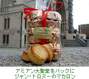 このマカロンにはこんな話が。「1660年5月8日に太陽王ルイ14世とスペイン王女マリー・テレーズの結婚式がこの町でおこなわれた。フランスとスペインを上げてのお祝いなので、町全体が歓喜に踊るようだった。商人たちは競って贈り物をした。王家の館のある同じ広場に店を構えていた菓子屋「アダム」は、店自慢のマカロンを贈り物にした。ふっくらと黄金色のマカロンは銀製トレーにのせて、美しく気立てのよい従業員ガチューシャが王妃の前に差し出した。王妃は口いっぱいに広がるアーモンドの香ばしさに感激して、ご褒美にクリスタルと金で装飾されたロザリオをくださった。ガチューシャはその後アダムの甥と結婚して末永くこの店の伝統を守り続けた・・・。」