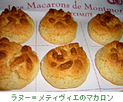 マカロン・ド・モンモリオンMacarons de Montmorillion ポワトゥー地方モンモリオンのマカロン。特徴は卵白と砂糖がやや多めで、ア−モンド、砂糖、卵白をペースト状にして鍋で水分を飛ばして、星の口金で王冠状に絞って焼きます。香ばしくて、ややねっちりと柔らかめ。モンモリオンのマカロン屋さん『Rannou-Mtivier』には大きくとぐろを巻いた形のものや、クリスマス限定のチョコレート風味のものも置いてありました。