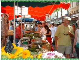クロワ・ルースには、火曜日から日曜日の朝7時頃から正午頃までマルシェが立ち、特に日曜日は、早朝から賑わいを見せる。いまは天気のよい夏の日曜日だけに、各店のカラフルなパラソルが光に映え、緑樹と木漏れ日を背景に、マルシェに華を添えている。メインストリートの歩道に沿って、各種の出店が数百メートルにわたり軒を並べている。果物屋、八百屋、魚屋、ソーセージを軒先に下げた肉屋、チーズ屋はもちろんのこと、ラベンダーやカモミール等を扱う乾燥ハーブ屋、ハチミツ屋、薪窯で焼き上げたというパン屋の出店も見かけられ、さまざまな地元の食材が、ところ狭しと並べられている。通りには、威勢のいい店主の掛け声が交錯し、籐かごを抱えた人たちで混みあう。行き交う人の何人かが、小脇にバゲットを抱えているのが、いかにもフランスらしい。 |