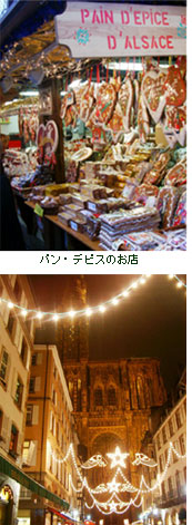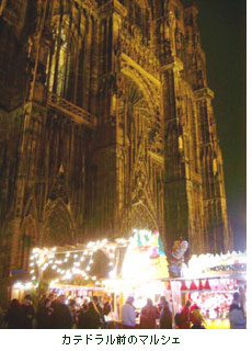 さて、マルシェ・ド・ノエル(以後マルシェ)ですが、11月の終わりからクリスマス前くらいまでの約一ヶ月の間、フランス各地で行われます。なかでもストラスブールのマルシェは有名で、カテドラル(大聖堂)前の広場に市が立ちます。 |