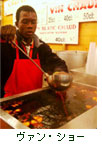 ここでまず僕が探したのは、赤ワインにシナモン、八角、クローブ(丁子)などのスパイス、それにオレンジのスライスなどを入れたヴァン・ショー。温かいワインという意味の通り温めたもので、これを飲むと体がすぐに温まります。写真のように、こんな大きななべで売っているんです。日本ではあまりなじみがありませんが、コレは寒いマルシェでは欠かせません(と思います)。よく探すと白ワインやロゼワインで作ったもの、アルコールがだめな人に温かいオレンジジュースというのもあります。 |