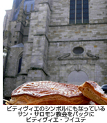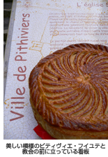 すらりとした教会を持つ町に入ると早速パティスリーを探す。しかし町のあちらこちらで区画整理の工事中のため、足元は土むき出し、石がゴロゴロ…歩きづらい。観光案内所にはパティスリーの住所の載ったパンフレットまである。さすがピティヴィエだね。 |