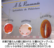 1月にはフランス中でガレット・デ・ロワという、ピティヴィエ・フイユテに似たケーキが出回る。これはキリスト教のエピファニー(公現祭)の行事菓子で、クリームの量や表面の模様が多少し違ったりするが、ほぼピティヴィエと同じ。唯一大きく違っているのがフェーヴと呼ばれる陶器製のマスコットが中に隠されていること。自分のポーションにフェーヴが入っていた人がその日1日王様になれる(もちろん仲間うちで)というめでたい菓子。皆が集まると新年の運試し(おみくじ)のようにガレット・デ・ロワ(王様のガレット)を食べる。全国で売っているというのに、このピティヴィエには毎年100キロ以上も遠く離れた街からも客が来るという。