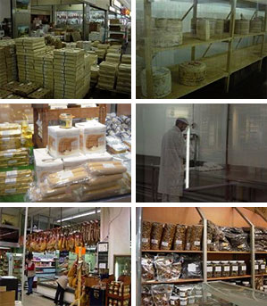 他にも市場内に並んでいたものを写真に沿って説明していきましょう。木箱に入ったチーズ(写真上左)やチーズの熟成室(同上右)。乾物・高級食材にはフォアグラの加工品(同中左)、瓶詰のトリュフやキャビア、生ハム、乾燥セップ・モリーユ、香辛料、油、酢、製菓用品、コーヒー、紅茶などがあります。フォアグラの重さを量って、真空パックにする作業は独立した部屋で行われています(同中右)。他にもスペイン産ハムやサラミが吊り下がっていたり(同左)、セップ、モリーユなど乾燥のきのこ類が所狭しと並んでいます(同下右)。 |
