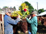 2頭の牛にトランジュマンスの シンボルの花束をつける