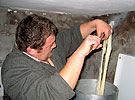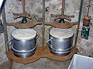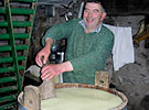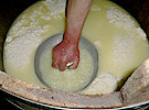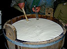 棒の先に目の粗い網がついている器具でカイエを細かく切る。 乳清が出てくる
