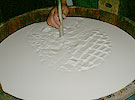しばらく放置するとカイエが底に沈澱。板を使って混ぜると、 ある程度の塊にまとまる