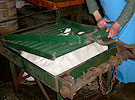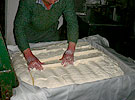 水分を十分に抜くため、カイエを刻んで向きを変えて再びプレス。この操作を6〜10回繰り返す