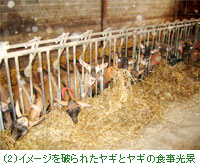 町の中心から車で3分ほど行ったところにあるフェルミエ(注3)のルーフさんのお宅で、チーズ作りを手伝わせてもらうことにした(写真1)。ルーフさんの家では、162匹のヤギを飼育している。ヤギというと白や黒で、小さい感じがしていたが、ルーフさんの家で飼っているのは全て私より大きな茶色いヤギ。 私の描いていたイメージでは、春には緑の草をいっぱい食べて、草の香りのするおいしいお乳が搾られて、そのお乳で作るチーズは一味違う旬の味・・・だったが、ここの家では、年中外には放さず、同じえさを与えているということだった(写真2)。だから、旬の今はヤギのお乳の量は増えるが、味は年中変わらないとのこと。「もちろん外に放しているところもあるし、そうすれば少し味も変わるだろうね。でもヤギの数が多いので、放つと草を食い尽くし、1ヶ月もすると草が生えなくなるからね。それは無理よ」とメインでチーズ作りをしているお母さんのマドレーヌはいっていた。 |