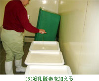 まず凝乳酵素を入れてしっかり混ぜ、それから触らないで2日間放置する(写真5)。凝乳酵素の量はバケツ1杯のミルクに対してキャップ半分。なんともアバウト。出来上がりは固まりの強いものもたまにあり、「これはちょっと固かったわね」なんて、これぞフェルミエ、と少し感激。 |