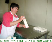 次にデムレ(型から出す、写真8)。水分が抜け、木綿豆腐くらいの固さになったチーズを割らないように型から出し、きれいに並べ、長さをそろえてカットする(17cm)。 |