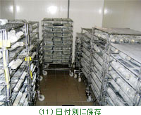 そしてアフィナージュ(熟成、写真11)。湿度80%、12〜15℃で保存。産地内で10日以上熟成させたもののみAOCサントモール・ド・トゥーレーヌと名乗るころができる。 チーズ作りはこれで終了。10日熟成のものは、表面は黒く、カビがまだ生えていない。最初の状態と見た目はあまり変わらない。食べると本当にフレッシュで、水分含量が多くやわらかく、今まで味わったころのない味。2週間、3週間と熟成させるにつれて、表面は黒から灰色に変わっていく(カビが出てくる)。3週間を超えると、紙に包んで冷蔵庫に移し、熟成をストップさせる。後は少しずつセック(水分が抜けて、固くなる)の状態になっていく(写真12 13)。 |