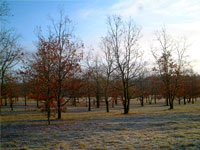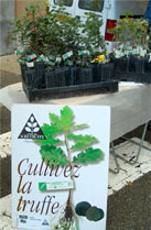 トリュフが共生する木はトリュフの種類によっても違う。ここではヨーロッパナラ、セイヨウヒイラギガシ、セイヨウハシバミの苗木の根にトリュフの胞子がついて菌根が出来るのを待ち、トリュフの好む環境の土地に移植する。これがトリュフ園なのだが、ハシバミで4〜5年、ヒイラギガシで10年、ナラで14〜15年たたないとトリュフは収穫できないという。また、移植しても土地に適合できなければ、トリュフは採れない。長い年月と、自然の力に任せる部分が多く、トリュフ園だけで生計を立てる人はいない。