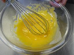 卵黄は白っぽくなるまでしっかり混ぜてから、水を加える。