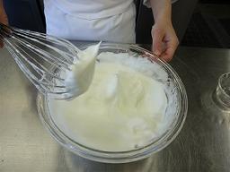 卵白に残りの砂糖を3回に分けて加えながら、角がピンと立つまで泡立てる。