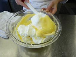 冷えたカスタードクリームに8分立ての生クリーム50mlを加えて混ぜ合わせ、半量は絞り出し袋に入れ、残りの半量には更に生クリームとレモンの皮を加え、流れるようなクリームにする。