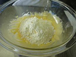 卵黄に1/3のメレンゲを入れ、馴染ませてから残りの卵白入れる。