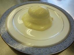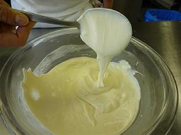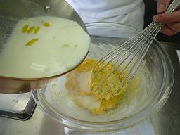 卵黄に空気を入れることによって、熱い牛乳を入れた時に固まるのを防ぐ。