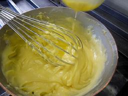 牛乳にレモンの皮を入れて温める。卵黄に砂糖を入れて混ぜ、白っぽくなったところに、薄力粉を入れて軽く混ぜる。