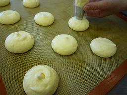 丸い口金をつけた絞り出し袋に入れ、紙を敷いたオーブンプレートに直径6cmに絞り出す。160℃のオーブンで15分焼く。