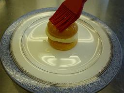皿に生地を置き、リモンチェッロを塗る。その上に絞り出し袋に入ったクリームを絞り出し、もう1枚生地をのせる。