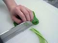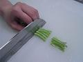 葉わさびは軸の繊維がしっかりしているので、太い部分は二つに裂きます。