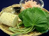 葉わさびの汁気を少し絞って、ながいもと混ぜるる。味を確認し、つけ地を加えて調節する。