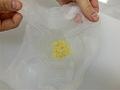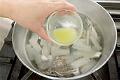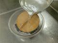7におとし蓋をのせて、さし水をした熱湯を注ぎ、箸でゆっくりかき混ぜる。おとし蓋の上から水を注いで冷ます。