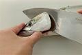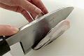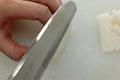 頭の位置を変えずに裏返し、同様に切り込む。かまの先端を切り離して頭を落とす。