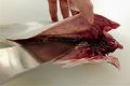 腹を包丁で開き、内臓を取り出す。中骨にそってある血合いの膜を、包丁の切っ先で切り開く。水の中で腹の中をきれいに洗う。