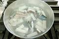生の魚や肉をさっと熱湯に通し、表面だけに火を通して霜がおりたようにすることを「霜降りにする」といいます。食材のくせ、ぬめり、脂肪分を取り、表面を固めてうまみを逃がさないなどの利点があります。また沸騰した湯をかけると皮が破けて、扱いにくくなるので、さし水をして沸騰を抑えます。