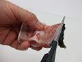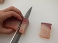 ブリのあらは適当な大きさに切る。ひれは、はさみで切って取り除く。