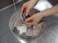 おとし蓋の上から水を注いで冷ましながら、表面を洗って身のぬめりやあらの血液や汚れを取り、水分を取る。