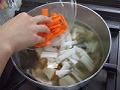 厚揚げ、こんにゃく、大根、にんじんを加えて火を通す。