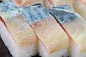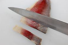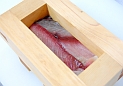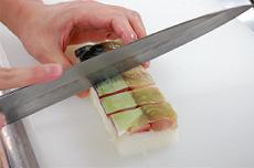 バッテラの仕上がりは、皮目と身の部分が半々で、血合いが真ん中にくると美しい。次からの方法で鯖を切り分けて、押し箱に詰める。