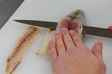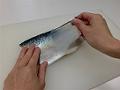鯖を、皮を下、尾のほうを右にしておく。身を上から3〜4枚にへぐ。