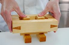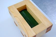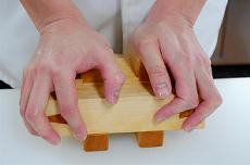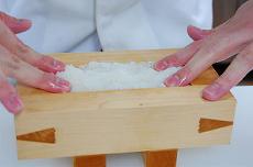 押し箱のふちまでしっかり詰めないと、すし飯の形に角が出ないので注意する。