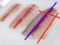 へいだ身のうち一番大きいものから、押し箱の底の半分の大きさの切り身を2枚取る。まず血合い部分(青い線)で半分に切る。次に尾に近いほうと腹側を落とす(赤い線)。