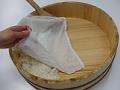 ばらんを押し箱の底の大きさに合わせて切る。これを2枚作る。手酢(水:酢を10:3の割合で合わせたもの)で表面を洗い、軽くふいてから底に1枚敷く。