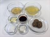 戻した干し椎茸の軸を切り落とし、ペーパータオルをのせたざるにあけて戻し汁をこし、50mlを量り取る。干し椎茸をたっぷりの熱湯で5分ゆで、ざるに上げて冷ます。